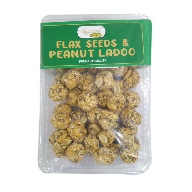 A wholesome ladoo combining roasted peanuts with nutrient-rich flax seeds, bound with jaggery for a guilt-free healthy treat.