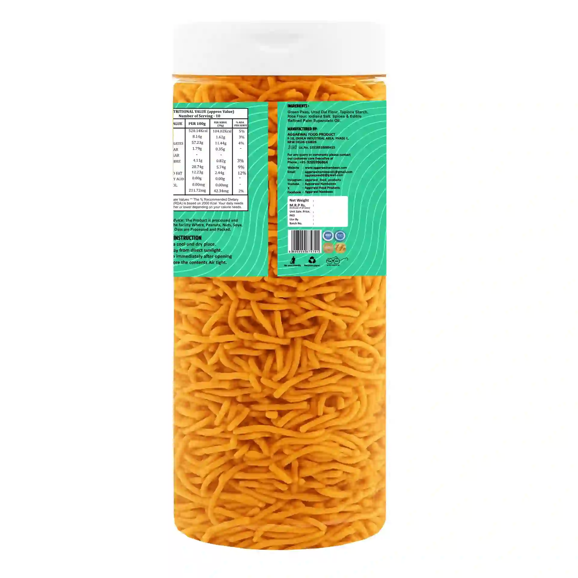 A savory and crunchy stir-fry bhujia made from green peas flour, seasoned with Indian spices. This protein-rich snack offers a satisfying texture with a mild, earthy flavor, perfect for guilt-free munching.