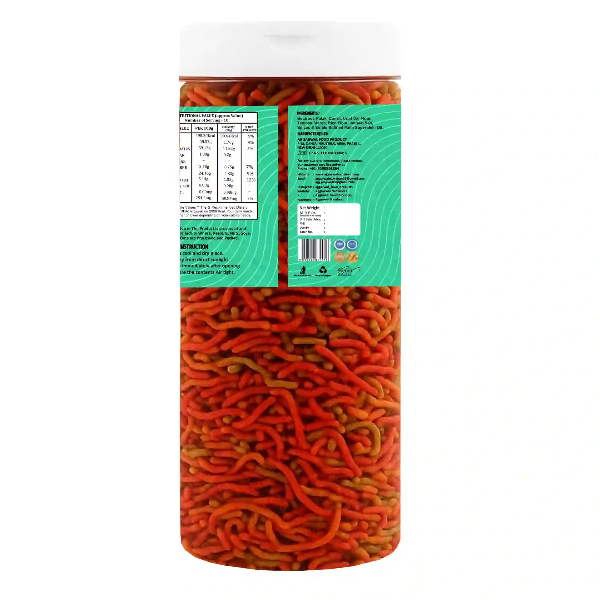 A medley of veggie crisps?beetroot, carrot, broccoli, and sweet potato?mixed with peanuts, lentils, and spices. It delivers a combination of textures, colors, and natural flavors for a wholesome, delightful snacking experience.