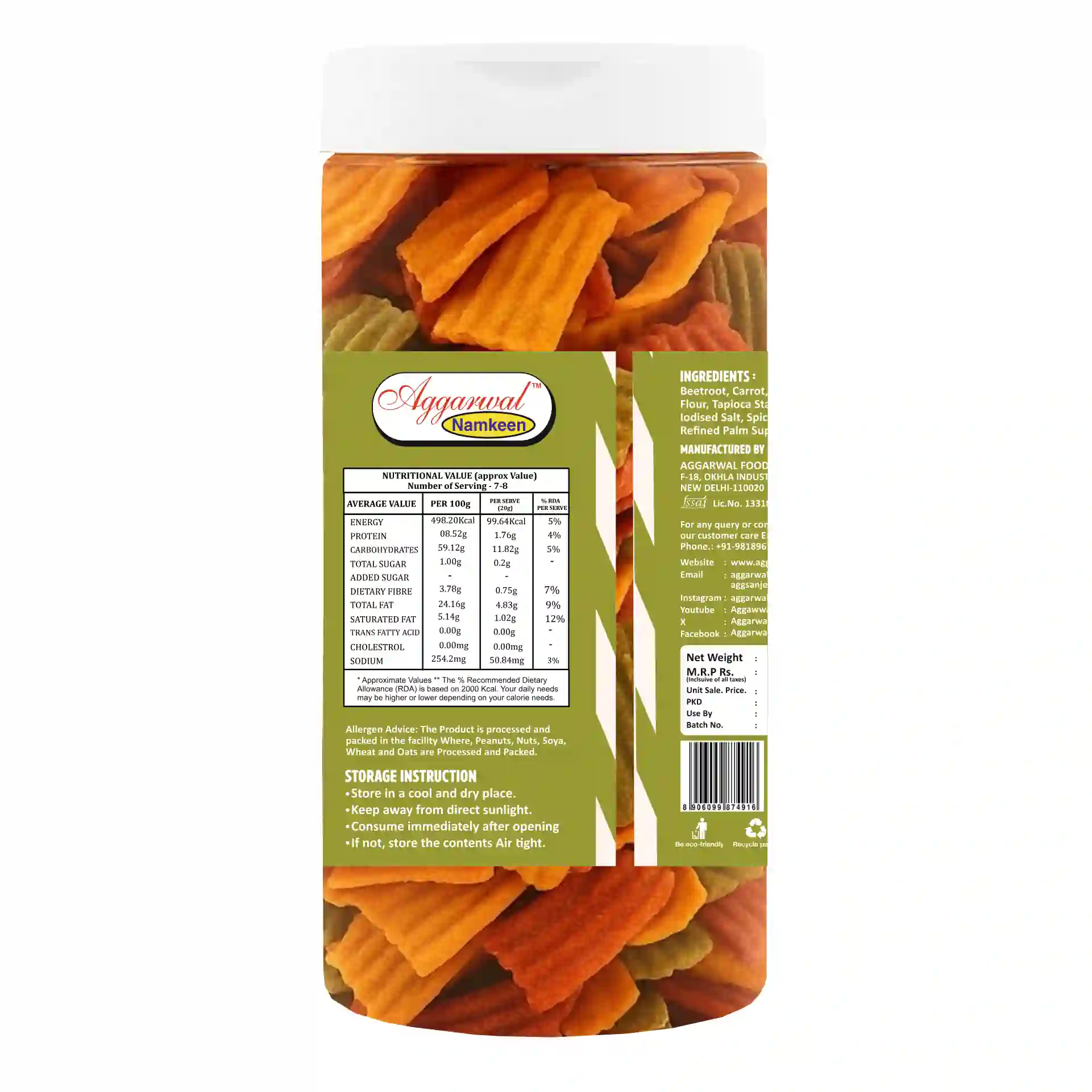A colorful mix of vegetables like beetroot, carrot, broccoli, and sweet potato, turned into crisp chips. This snack offers a medley of natural flavors, rich nutrients, and a satisfying crunch in every bite.