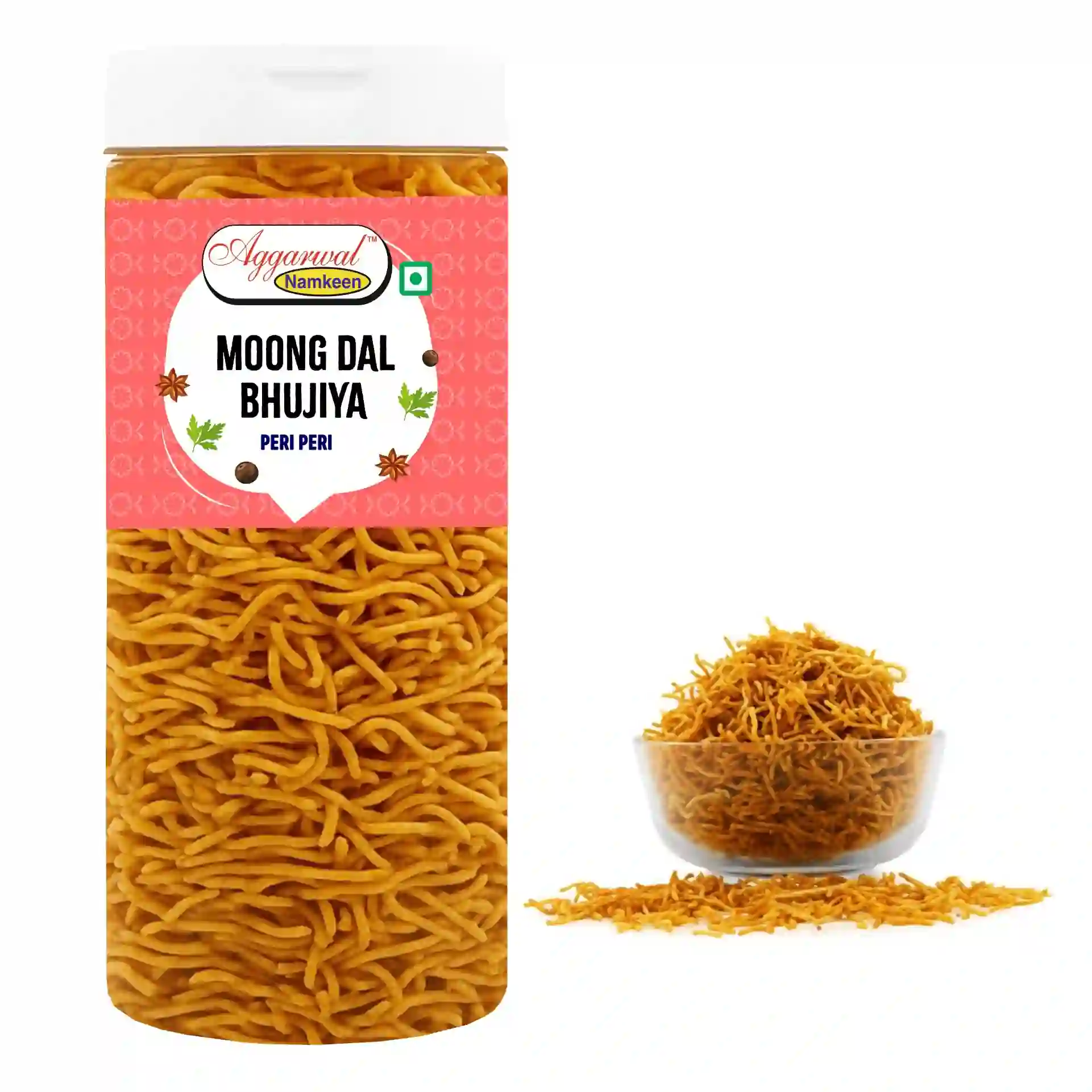 Moong bhujia is made from moong lentil flour, offering a crisp crunch with savory spices. Protein-packed and light, it?s a perfect choice for health-conscious snack lovers.